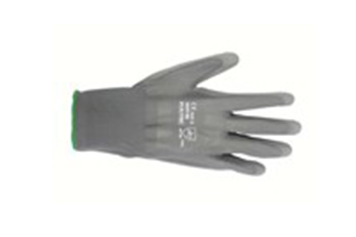 EN 388 CE. Nylongestrick, PU-Handflächenbeschichtung, elastische Stulpe.