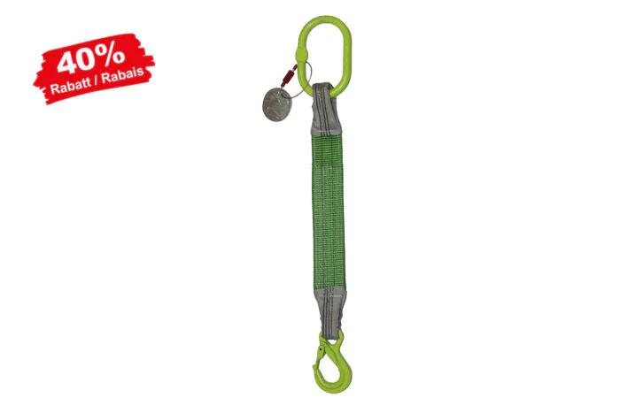 Bandstruppen-Gehänge 1-Strang mit Ösenhaken mit Sicherung (EN 1492-1). Verfügbar in unterschiedlichen Längen, weitere Längen auf Anfrage. Eine Farbe pro Tragfähigkeit und Breite erhältlich.