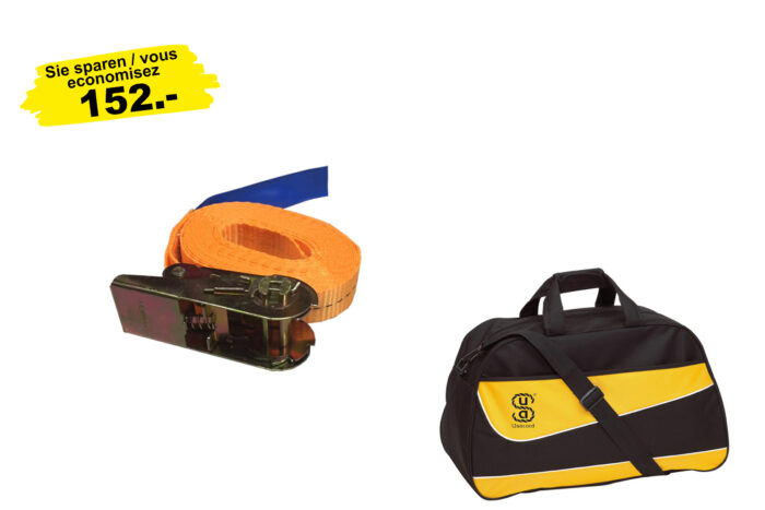 Umreifungsgurte mit Ratsche EN 12195-2. Werden in Kartons à 50 Stück verkauft. Gratis Stautasche zu jeder Verkaufseinheit (solange Vorrat).