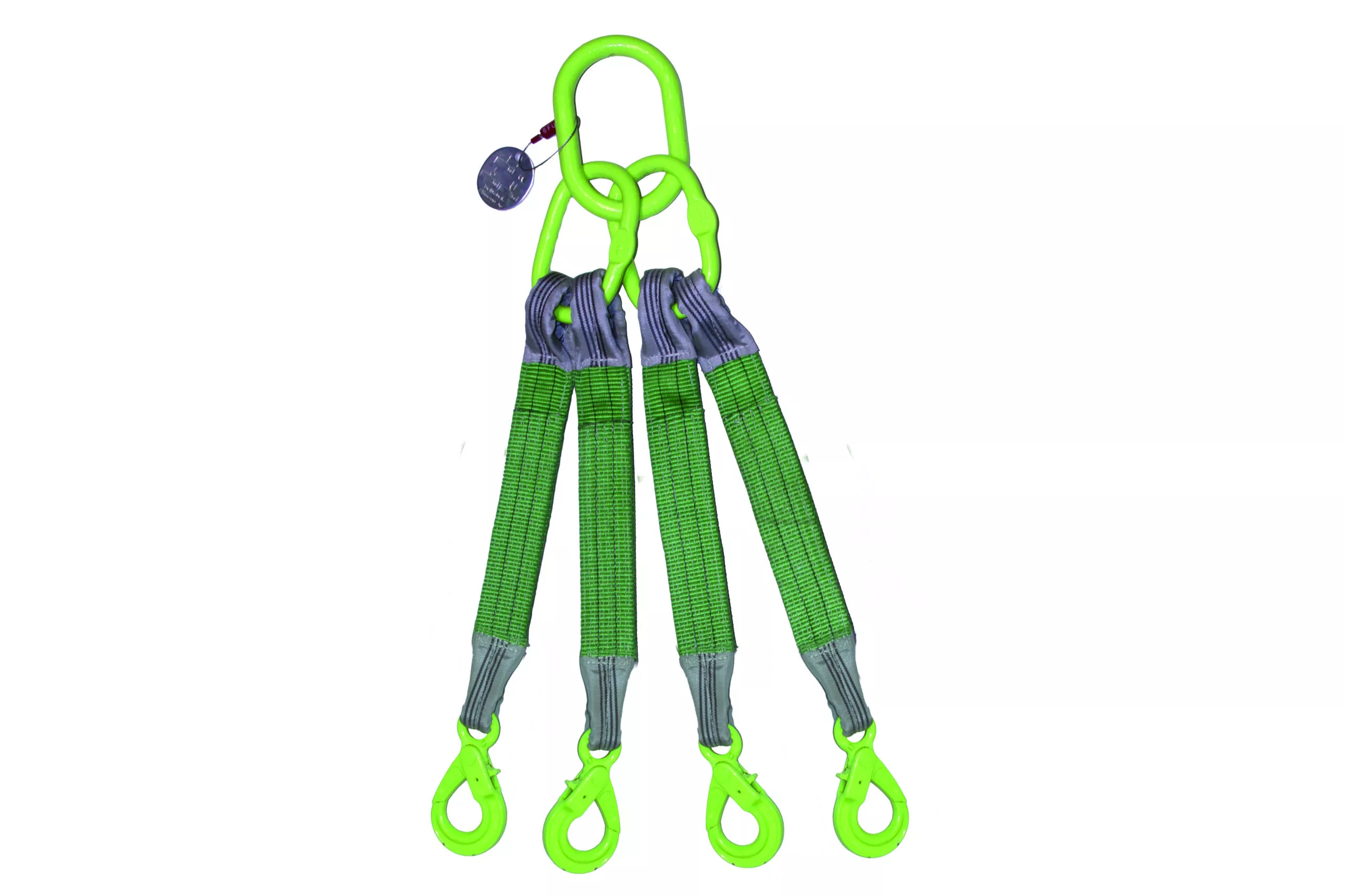 Bandstruppen-Gehänge 4-Strang mit Sicherheitslasthaken (EN 1492-1). Verfügbar in unterschiedlichen Längen, weitere Längen auf Anfrage. Eine Farbe pro Tragfähigkeit und Breite erhältlich.