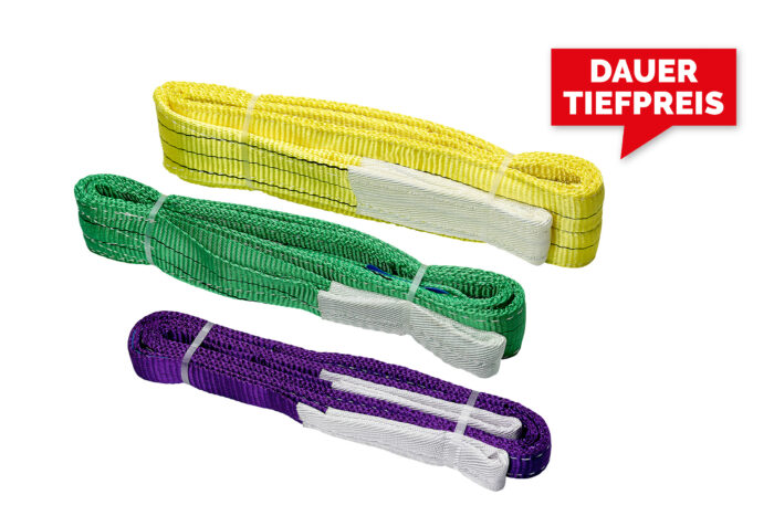 Hebegurte EN 1492-1. Eine Farbe pro Tragfähigkeit und Breite erhältlich. Verfügbar in unterschiedlichen Längen, weitere Längen auf Anfrage.
