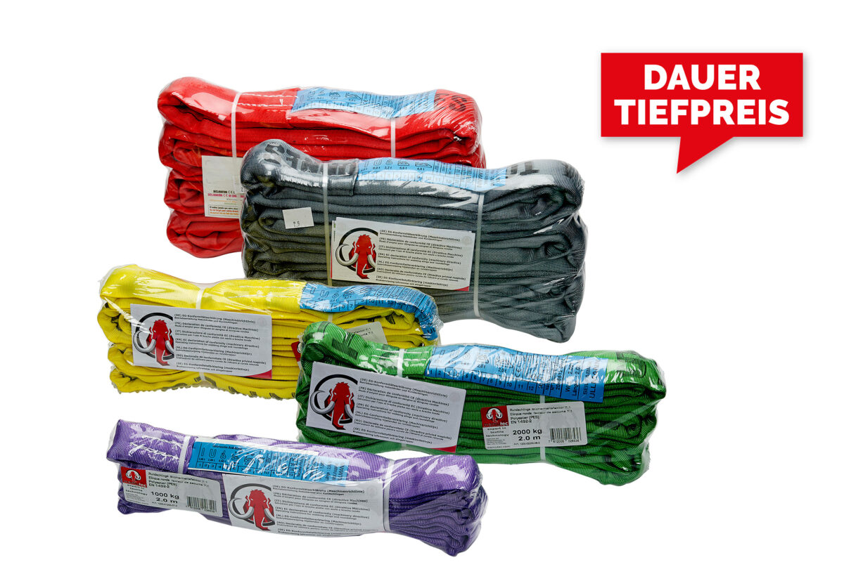 Preiswerte Rundschlingen Typ Orange-Line (EN 1492-2). Verfügbar in unterschiedlichen Längen. Eine Farbe pro Tragfähigkeit erhältlich.