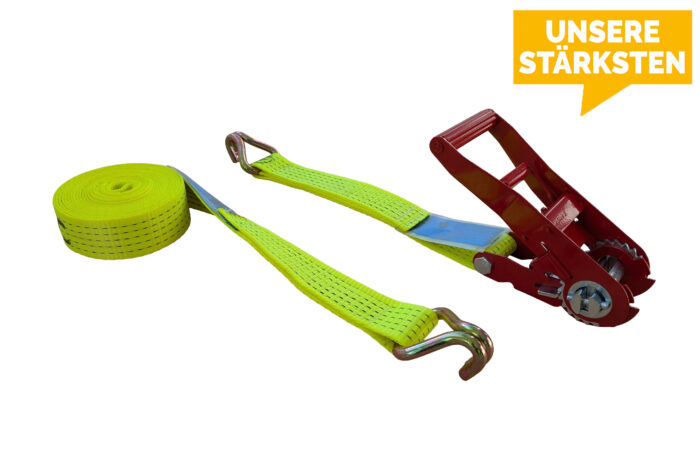 Zurrgurte mit extra robuster Ratsche Typ TD1 und Haken mit Klinken EN 12195-2. Breite Gurtband 50mm. Standardfarbe in leuchtgelb, weitere Farben auf Anfrage.