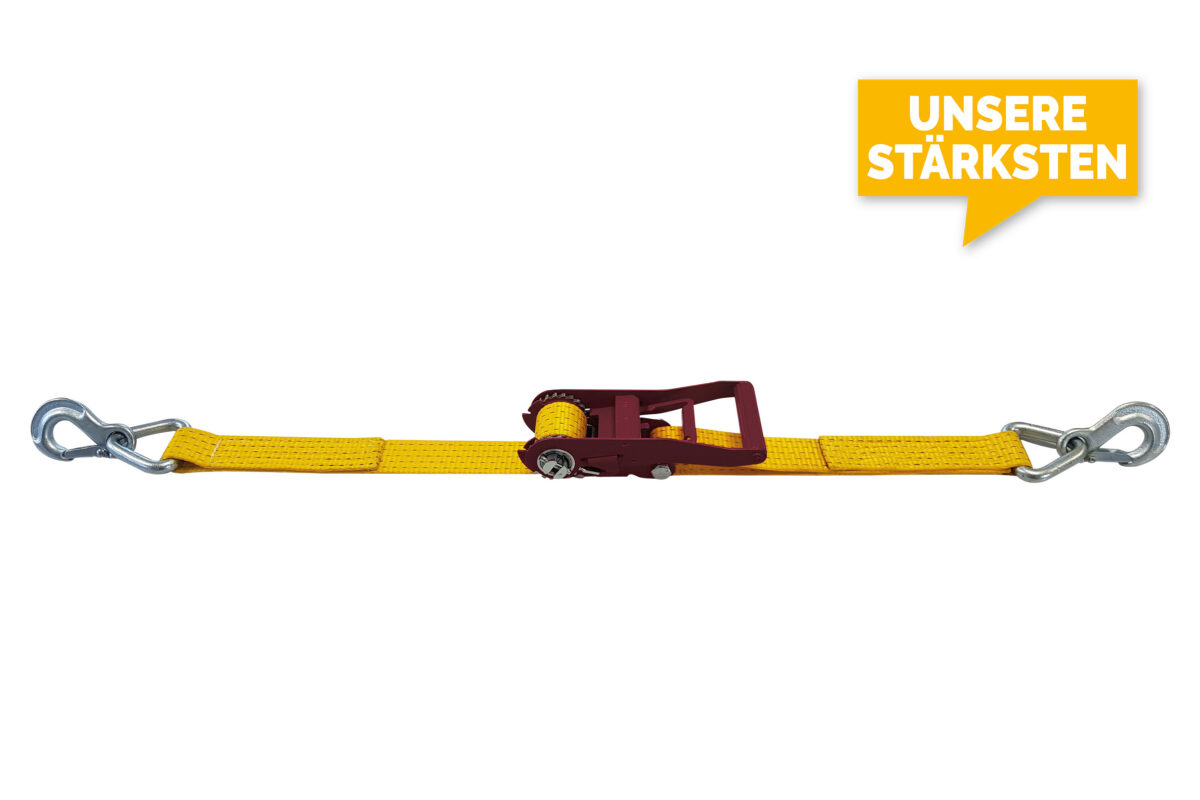 Zurrgurte mit extra robuster Ratsche Typ TD1 und Haken mit Klinken EN 12195-2. Breite Gurtband 50mm. Standardfarbe in leuchtgelb, weitere Farben auf Anfrage.