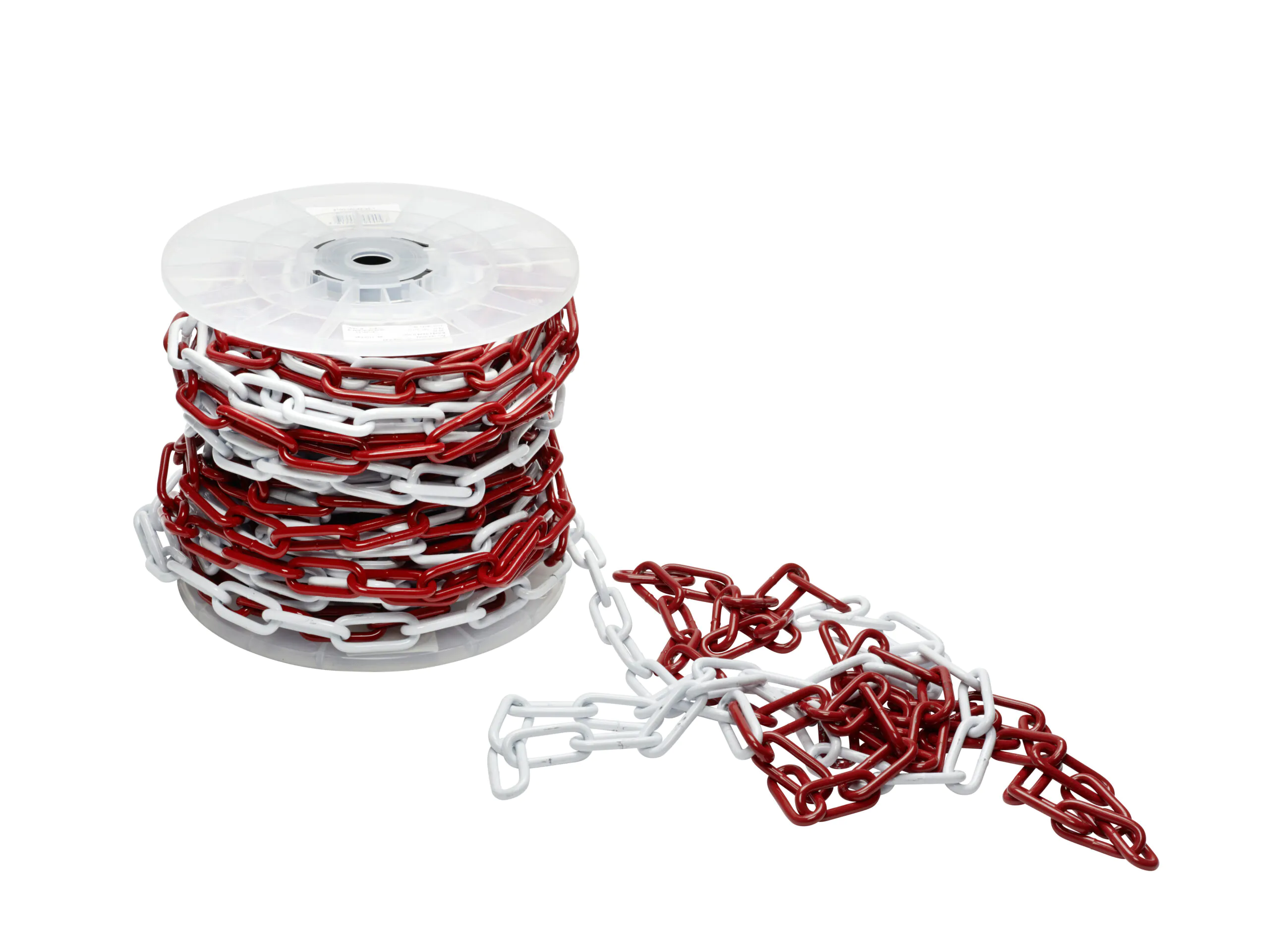 Kette aus langgliedrigen C-Gliedern. Stahl rot-weiss epoxiert. Verkauf per Spule.