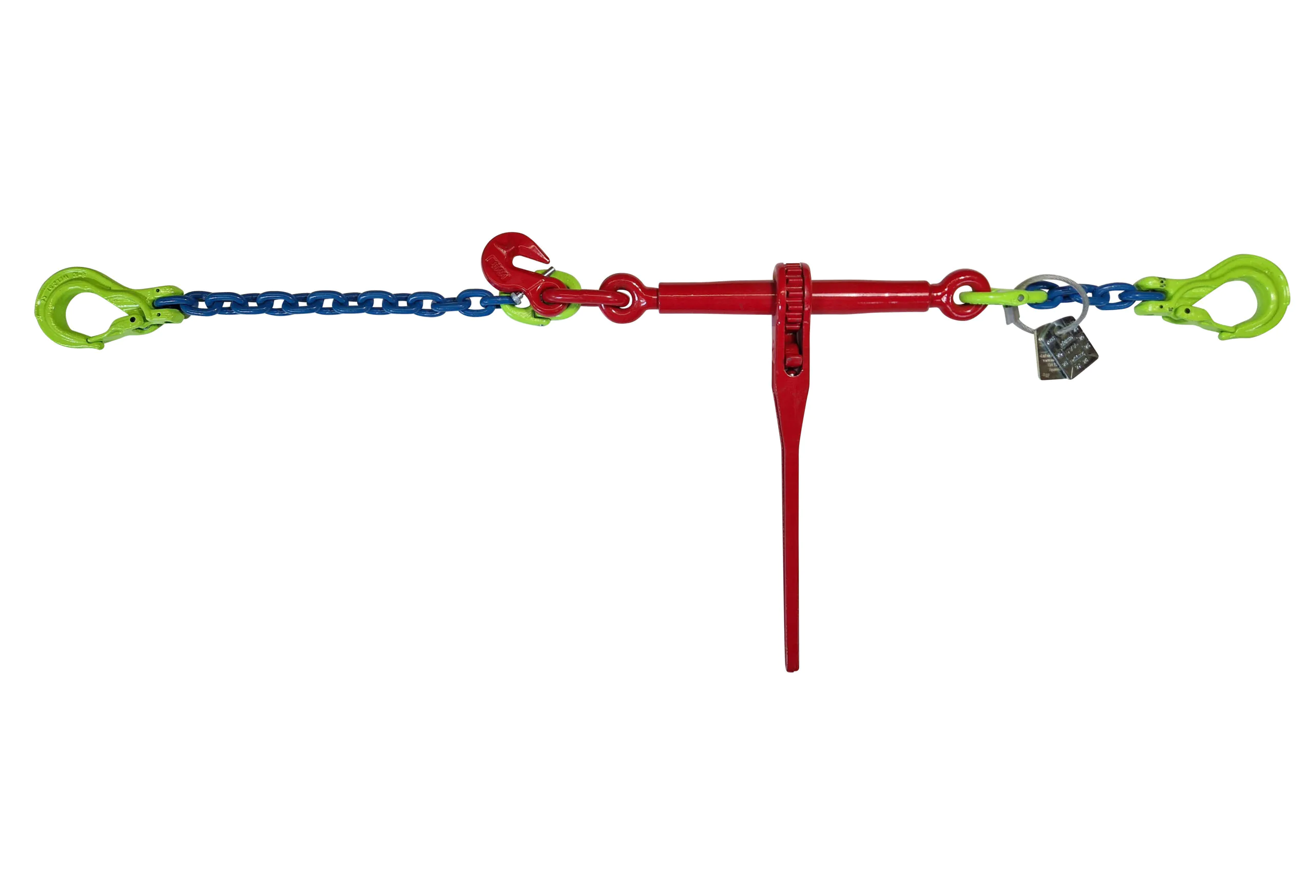 Ratschenspanner mit einseitig Kuppellasthaken und anderseitig Verkürzungshaken. Fix montierte Kette mit Kuppellasthaken. Güteklasse 8.