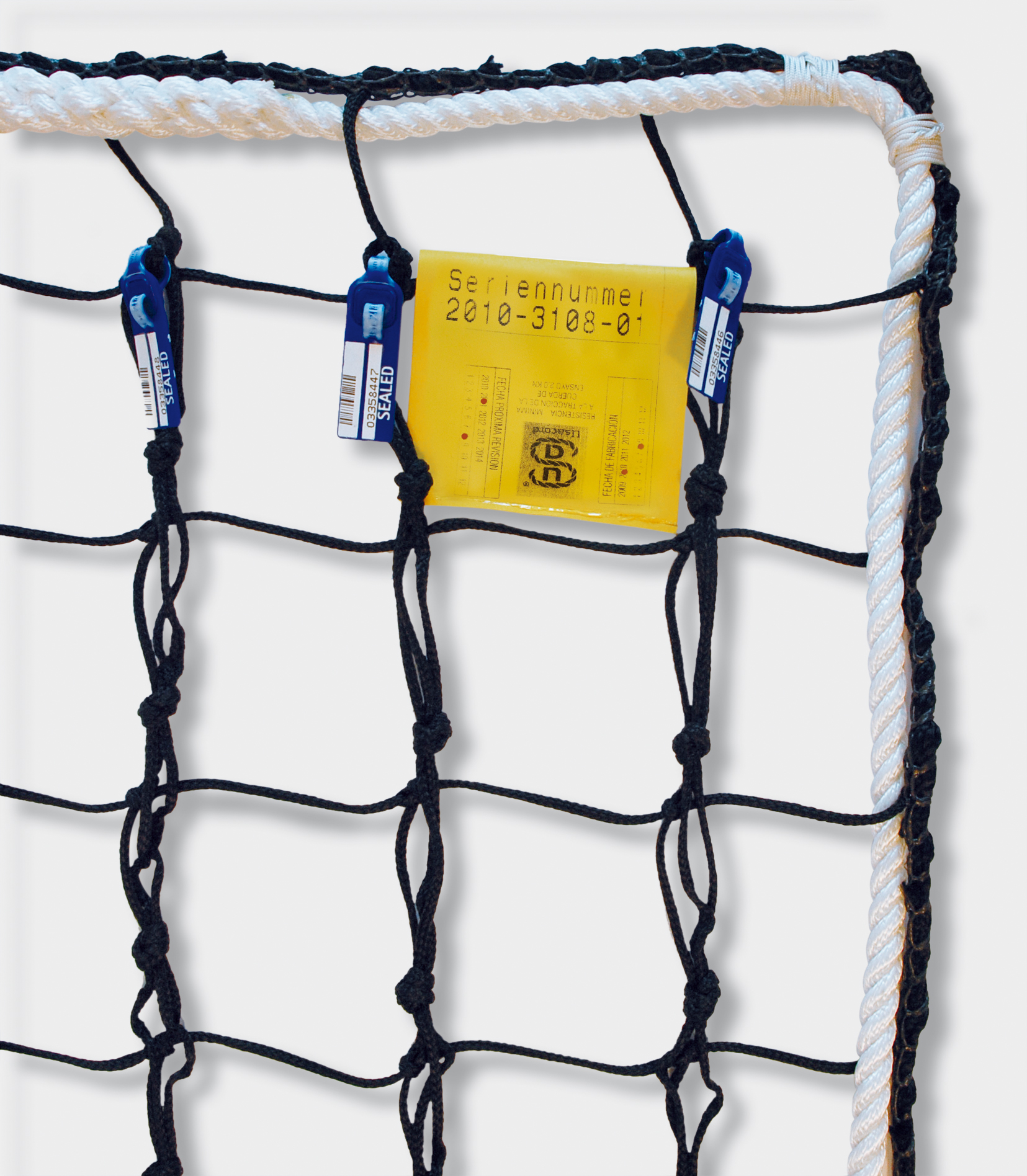 Fertig konfektionierte Netze für absturzgefährdeten Arbeiten. Mit Randverstärkung und Randleine 12 mm, ink. drei Prüfkordeln für die jährliche Reissprüfung und normbezogener Etikette nach SN EN 1263-1