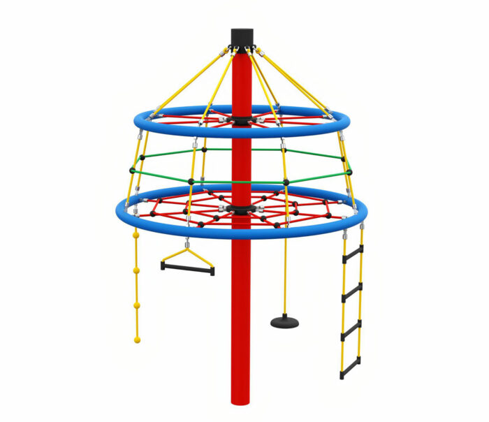Kletterturm mit verschiedenen Spielelementen wie Sitzteller, Strickleiter und Klettertau. 2m Durchmesser und 3m Höhe. Geeignet für bis zu 10 Benutzer zwischen 3 und 14 Jahren.