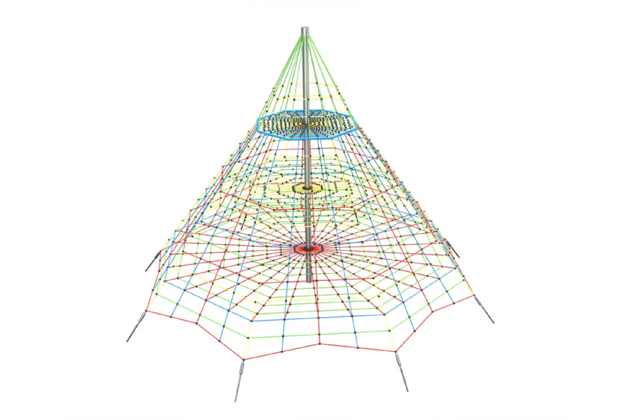 Kletterpyramide mit 6,5m Höhe und integriertem Netzboden zur Absturzsicherung. Geeignet für bis zu 98 Benutzer zwischen 6 und 14 Jahren.