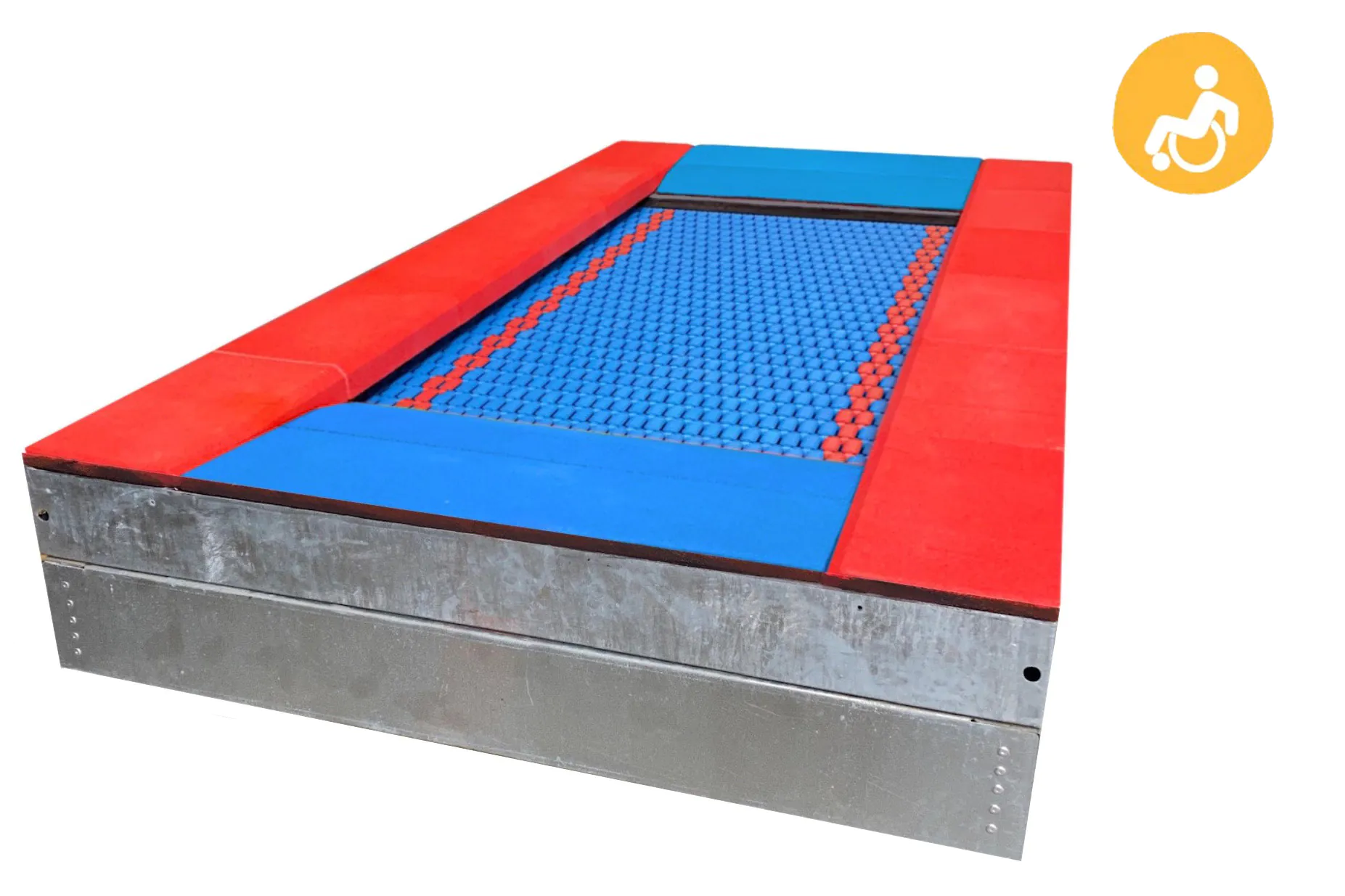 Rechteckiges Trampolin mit Sprungfläche 200 x 100 cm. Rampen erleichtern den Zugang auch mit Rollstühlen. Lamellen für die Sprungmatte und Fallschutzplatten in diversen Farbvarianten verfügbar.