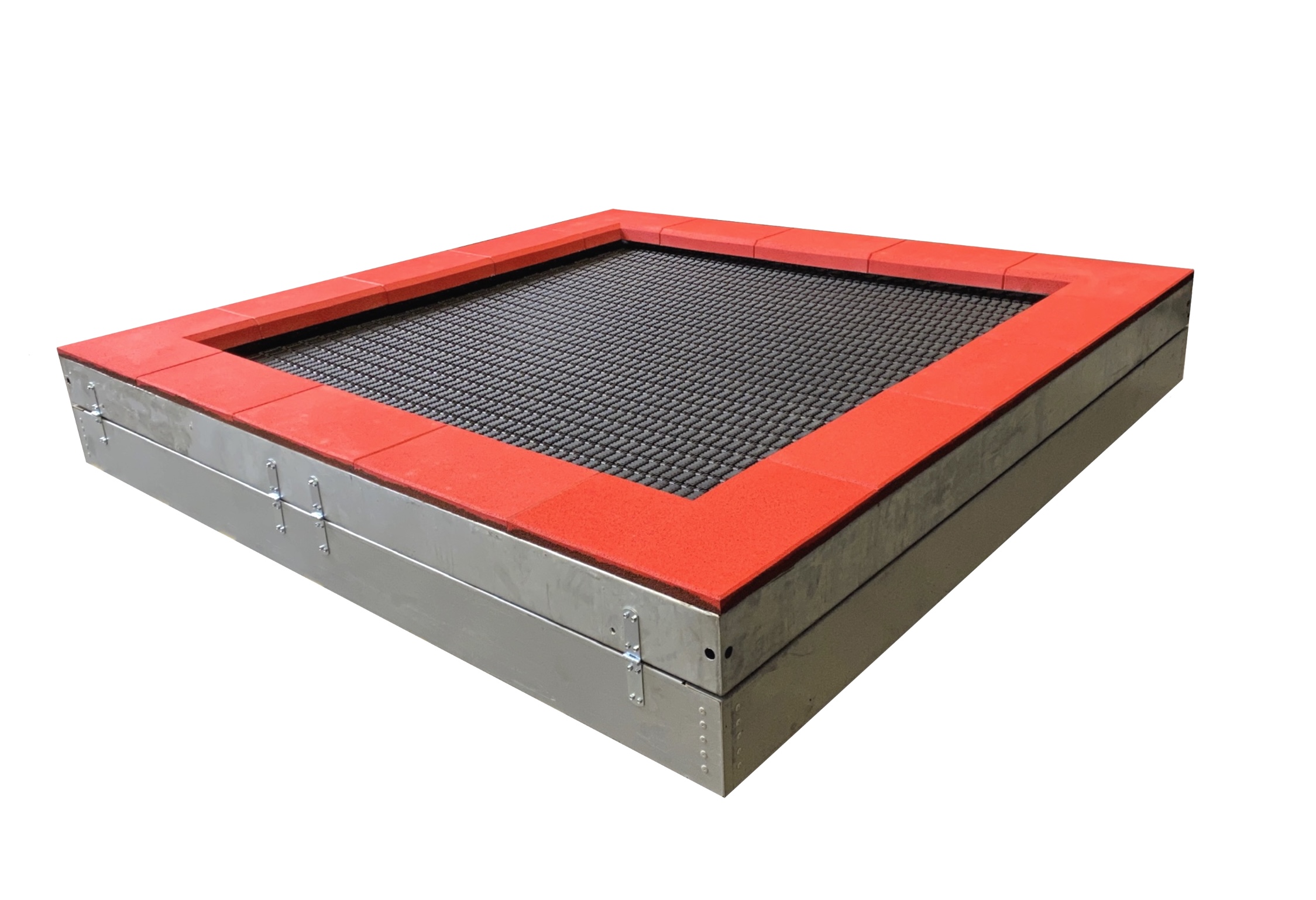 Trampolin mit Sprungfläche 200x200cm. Lamellen für die Sprungmatte und Fallschutzplatten in diversen Farbvarianten verfügbar.