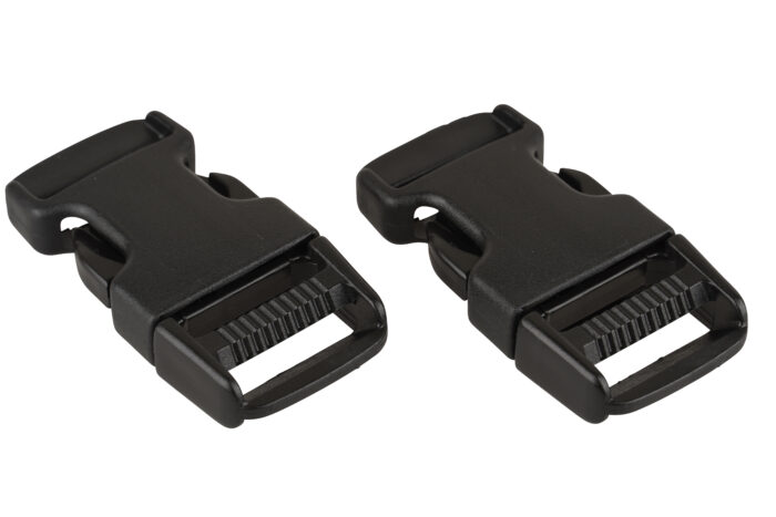 Boucle en plastique pour sangles. Disponible sous forme d’unité composée de 2 pièces pour largeur de sangle 25mm et d’une pièce pour largeur de sangle 40mm.