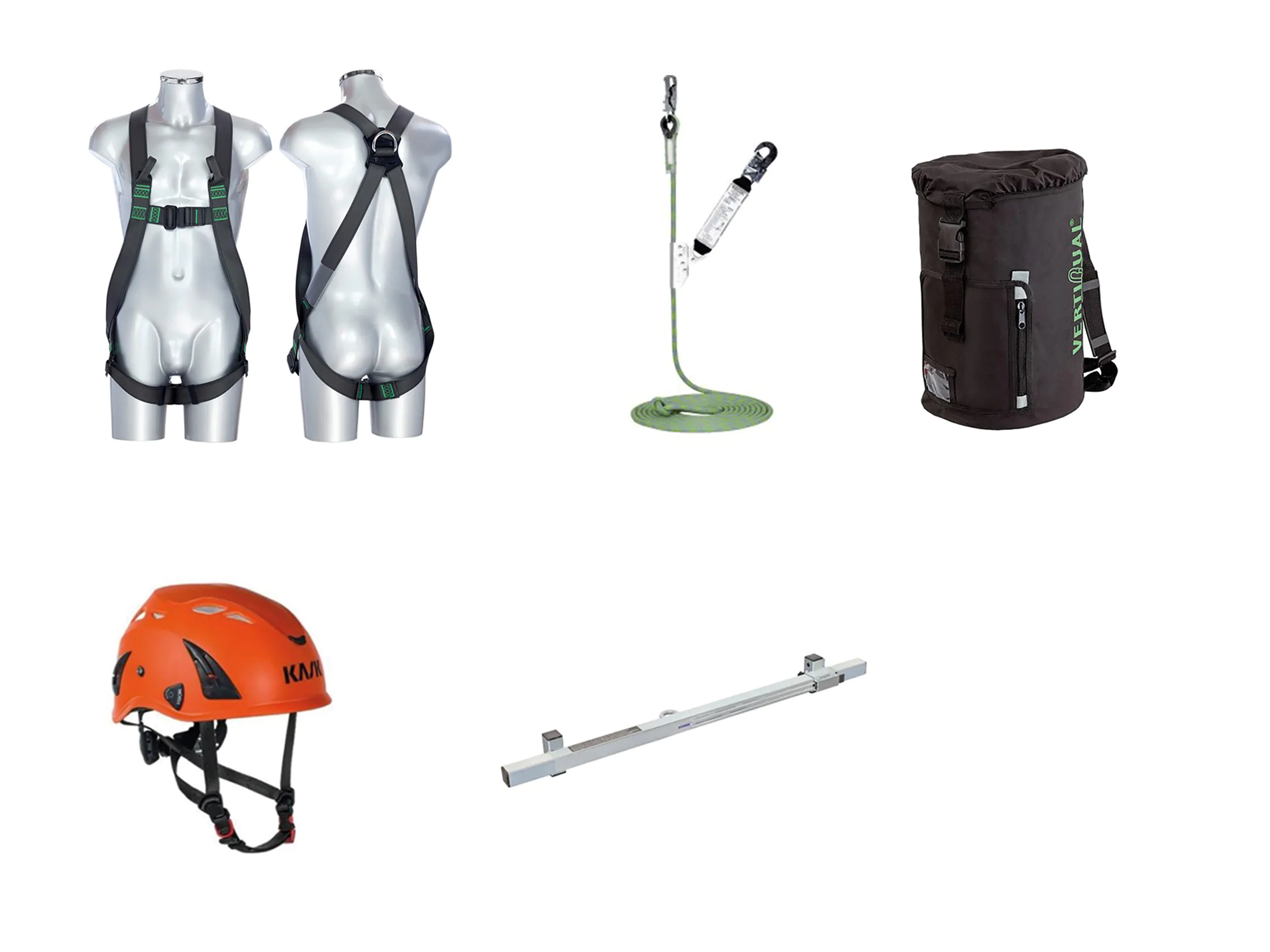 1 harnais de sécurité C3 Rapid + 1 antichute mobile 10 m de long + 1 casque conforme à EN 397 + 1 traverse de sécurité conforme à EN 795, classe B + 1 sac à dos de rangement
