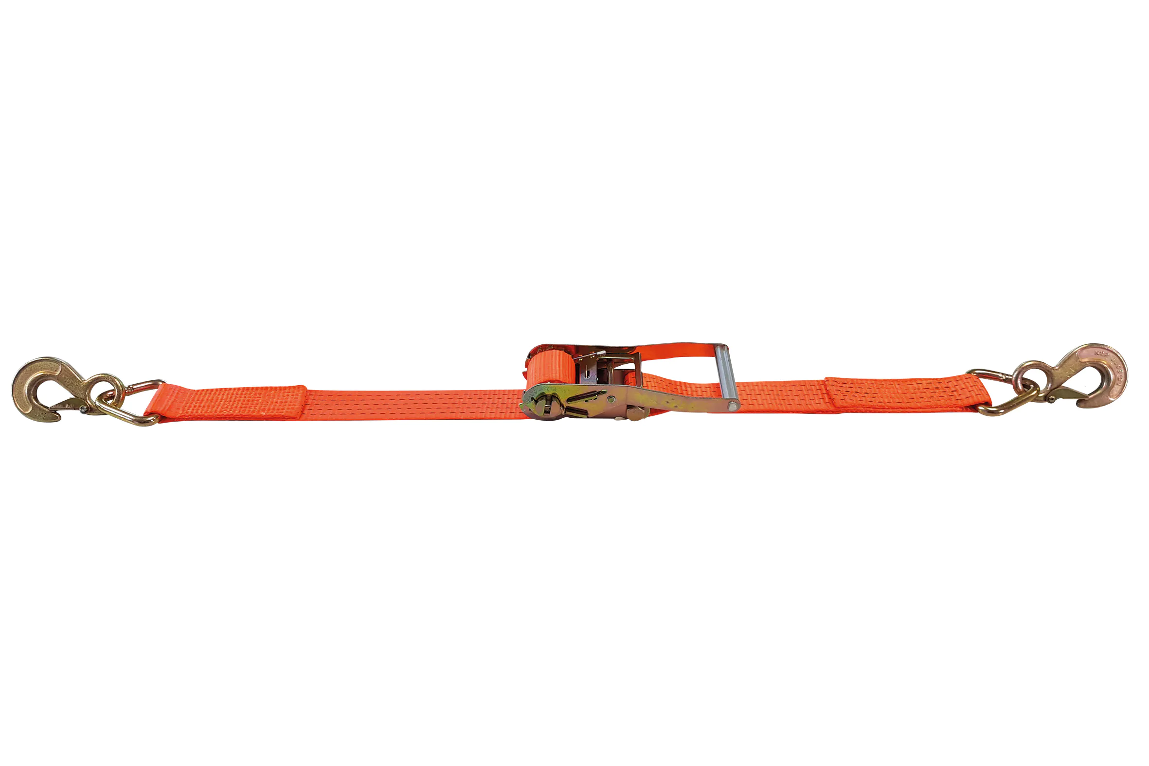 Sangles d’arrimage avec tendeur à cliquet et crochets à lames de sécurité EN 12195-2. Couleur standard en orange.