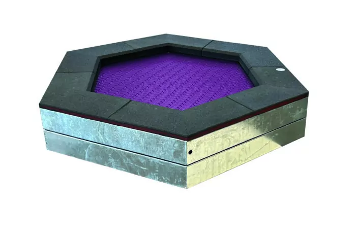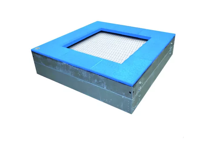 Trampoline rectangulaire long avec surface de saut de 850 x 100 m. Des rampes facilitent l’accès, même en fauteuil roulant. Lamelles pour le trampoline disponibles dans diverses variantes de couleurs.
