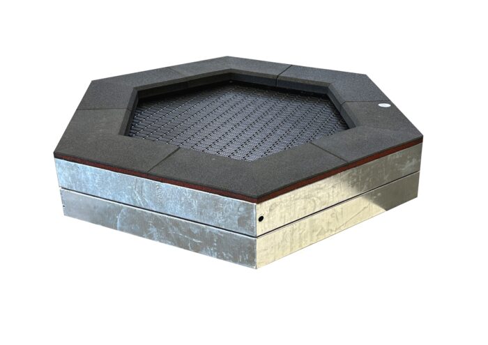 Trampoline hexagonal avec surface de saut de 125 cm de diamètre. Lamelles pour le trampoline et dalles de protection contre les chutes disponibles dans diverses variantes de couleurs.