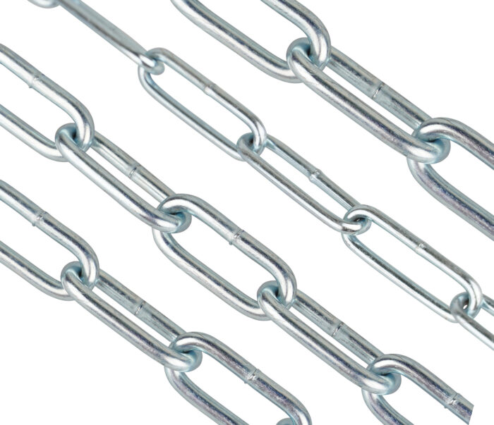 Chaîne en acier galvanisé, soudée. Ne convient pas au levage. Au choix sur grande bobine ou sur bobine de 5 m.