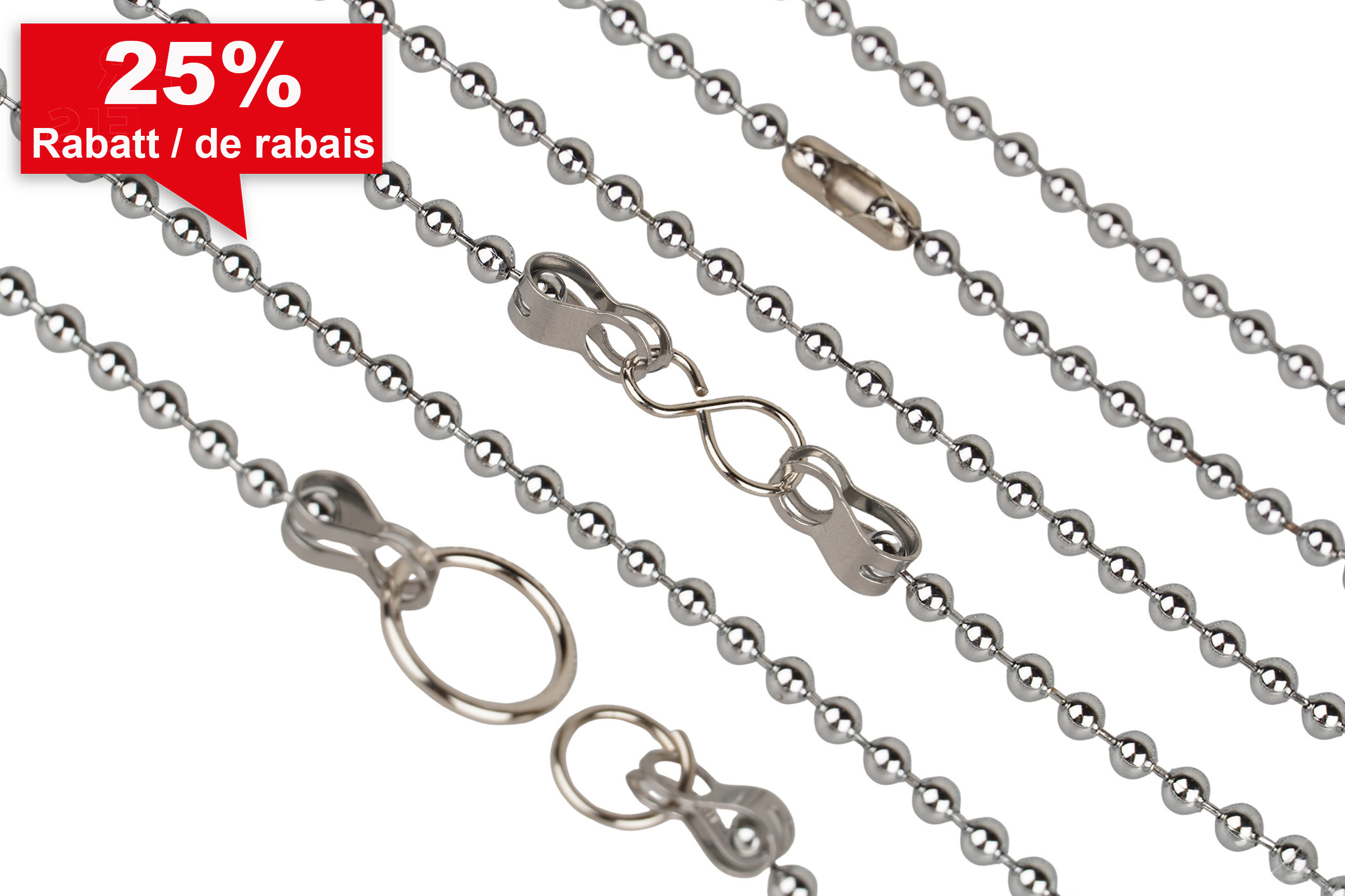 Chaînes à boules de haute qualité, résistantes aux rayures et à la corrosion. Pour la décoration et le quotidien. Ne convient pas pour le levage de charges. Vente par bobines entières.