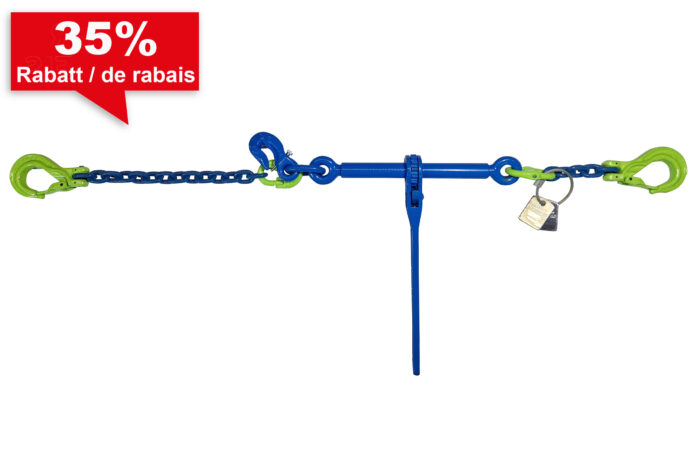 Tendeur à cliquet avec crochet à linguet à chape d’un côté et crochet de raccourcissement de l’autre. Chaîne à montage fixe avec crochet à linguet à chape. Qualité commerciale 10.