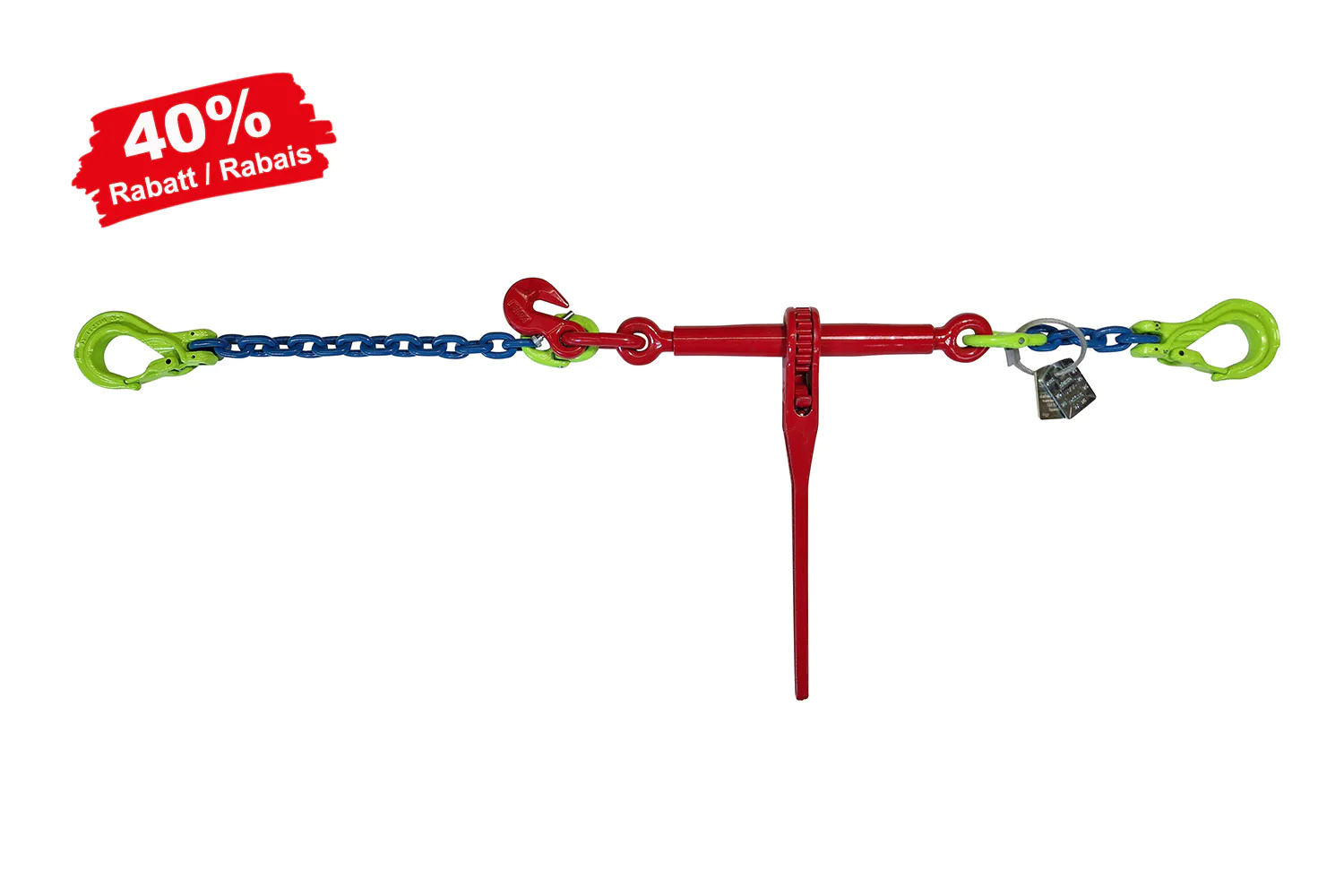 Tendeur à cliquet avec crochet à linguet à chape d’un côté et crochet de raccourcissement de l’autre. Chaîne à montage fixe avec crochet à linguet à chape. Qualité commerciale 8.