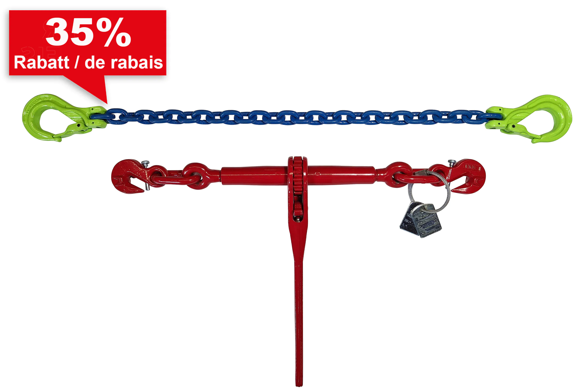 Tendeur à cliquet avec crochets de raccourcissement des deux côtés et chaîne avec crochets à linguet à chape des deux côtés. Qualité commerciale 8.