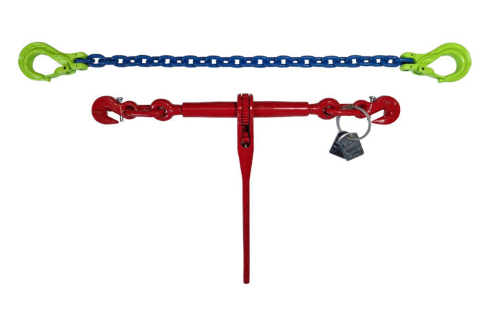 Tendeur à cliquet avec crochets de raccourcissement des deux côtés et chaîne avec crochets à linguet à chape des deux côtés. Qualité commerciale 8.