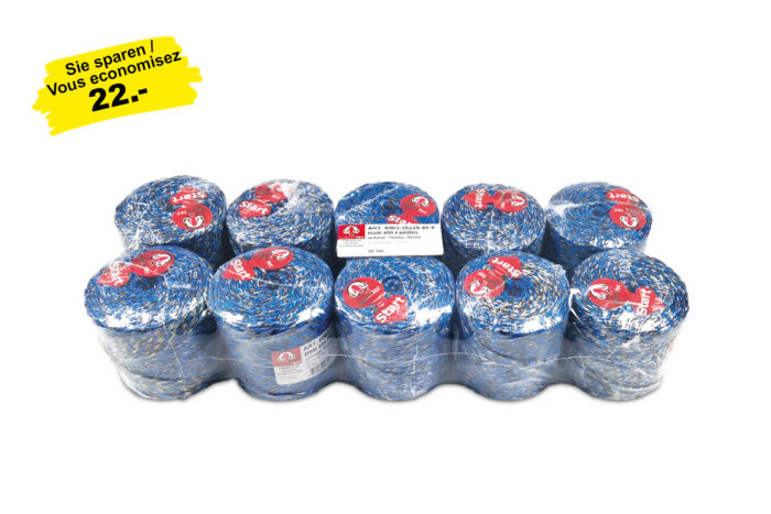 Épaisseur env. 2.5 mm, pelote de 0.5 kg, env. 225 m par pelote. Les couleurs peuvent varier.