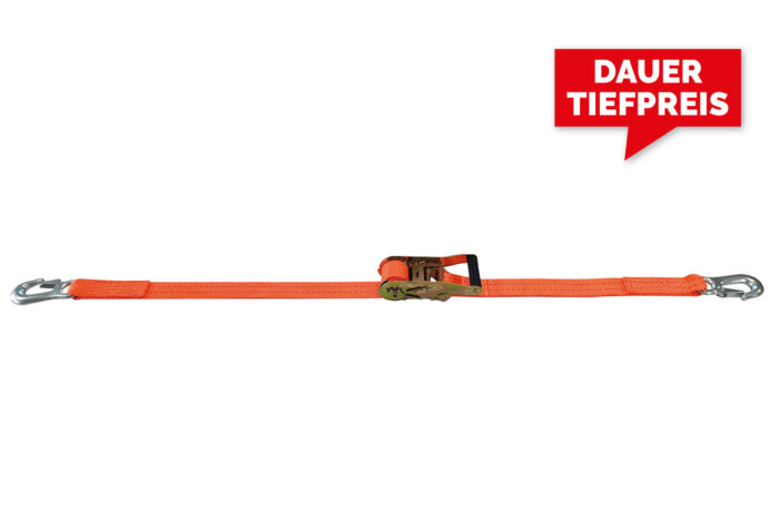 Sangles d‘arrimage avec tendeur à cliquet et mousquetons EN 12195-2. Couleur standard en orange.