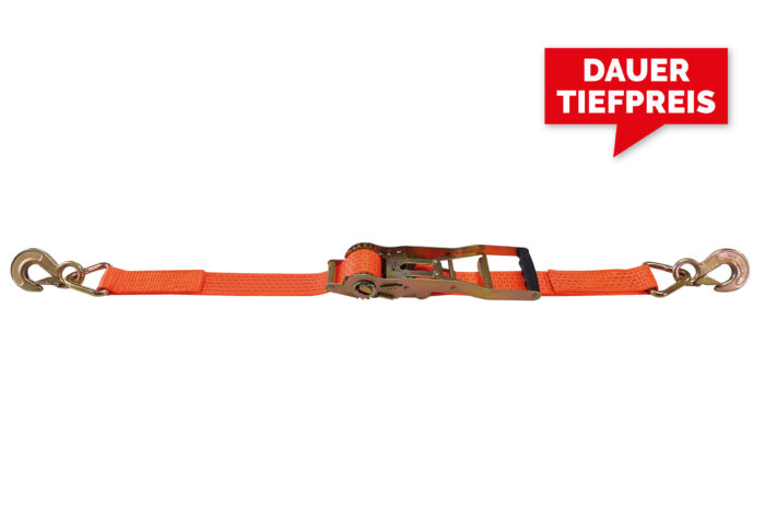 Sangles d’arrimage avec tendeur à cliquet à levier long et crochets à lames de sécurité EN 12195-2. Couleur standard en orange.