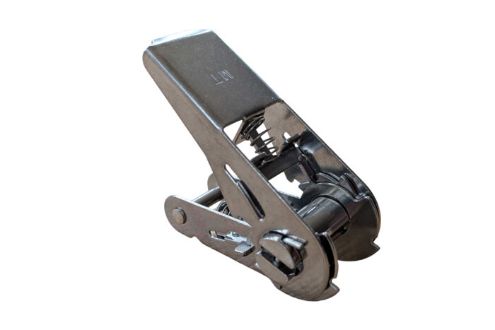 Sangles d’arrimage avec tendeur à cliquet et crochets à bout pointu en acier chromé (inoxydable) EN 12195-2. Couleur standard en gris.