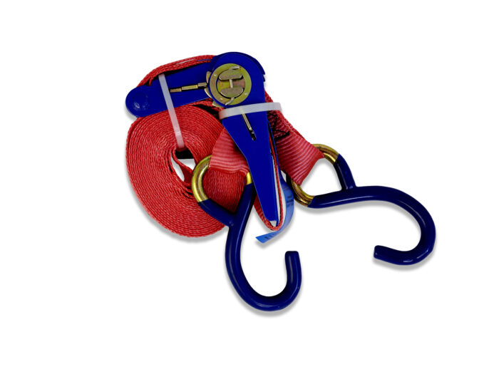Sangles d’arrimage avec tendeur à cliquet et crochets type «S» (gaine plastique) EN 12195-2. Couleur standard en rouge, autres couleurs sur demande.