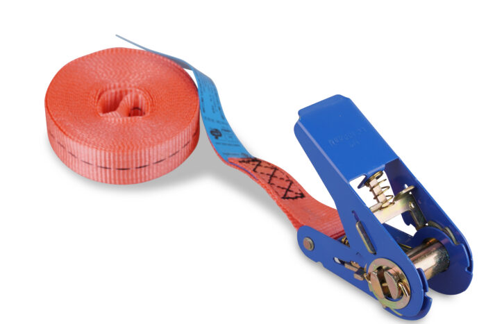 Sangles de cerclage avec tendeur à cliquet EN 12195-2. Couleur standard jaune, autres couleurs sur demande. Disponible en différentes longueurs.