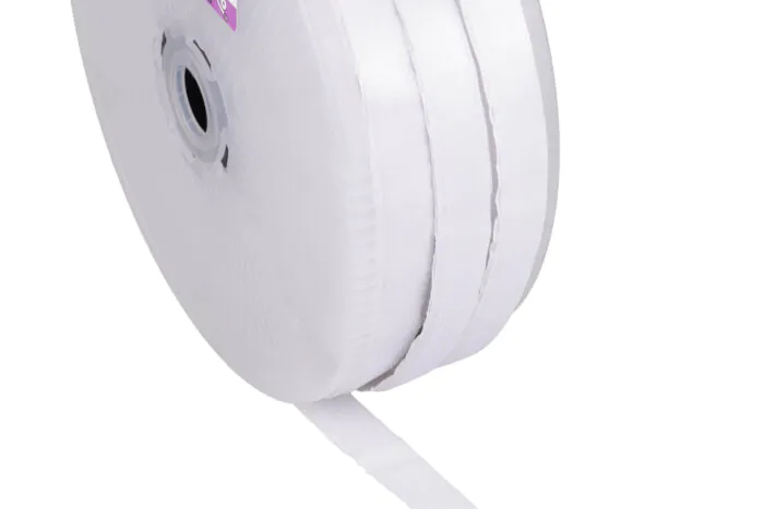 En polyamide, avec dos adhésif. Largeur 20mm. Disponible comme bande à boucles ou bande à crochets en deux couleurs.