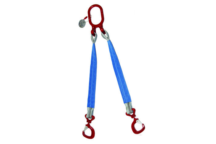 Elingue de chantier 2 brins avec crochet de charge avec linguet type GH / EN 1492-1. Avec protection contre l’abrasion cousue, couplage « système modulaire ». Largeur 60mm.